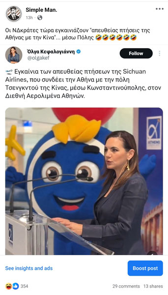 Στις 30 Ιουνίου η υπουργός Τουρισμού συμμετείχε στην εκδήλωση της Sichuan Airlines στον Διεθνή Αερολιμένα Αθηνών, για την έναρξη των πτήσεων που συνδέουν την Αθήνα με την πόλη Τσενγκντού της Κίνας, μέσω Κωνσταντινούπολης. Η Όλγα Κεφαλογιάννη, αναλογιζόμενη πως η κυβερνησάρα δεν διανύει και τις καλύτερες μέρες της, θέλησε να δώσει μια αίγλη επιτυχίας στην εκδήλωση, ισχυριζόμενη από τον προσωπικό της λογαριασμό στο Χ πως εγκαινίασε την έναρξη “απευθείας πτήσεων της Sichuan Airlines, που συνδέει την Αθήνα με την πόλη Τσενγκντού της Κίνας, μέσω Κωνσταντινούπολης”.
