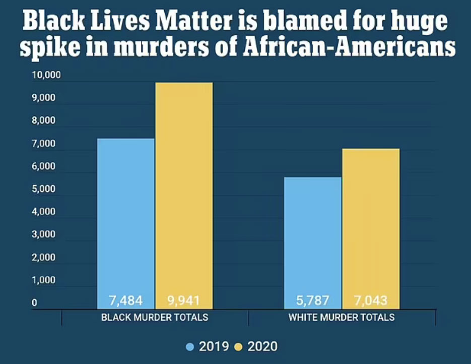Ο αριθμός των δολοφονημένων μαύρων στις ΗΠΑ το 20202 αυξήθηκε κατά 32%, η μεγαλύτερη αύξηση που καταγράφεται από το σωτήριον έτος 1905. Συγκεκριμένα 9.941 αφρο-αμερικανοί δολοφονήθηκαν το 2020, μια αύξηση κατα 2.457 σε σχέση με το 2019. Το ίδια στιγμή, οι ανθρωποκτονίες λευκών αυξήθηκαν εξίσου εντυπωσιακά από 5.787 σε 7.043, μια αύξηση 21%.